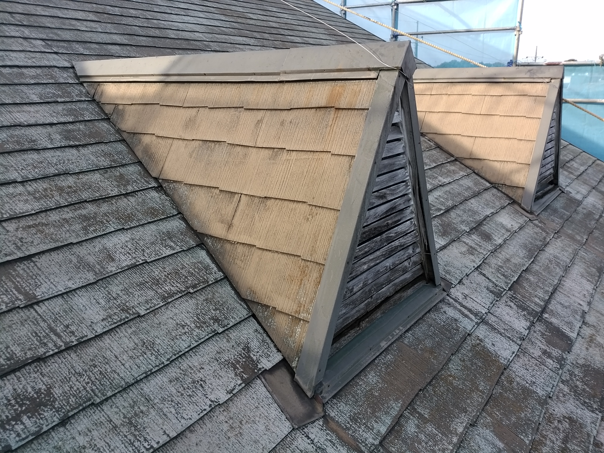 三角の通気口が2箇所備えた屋根が特徴的なS様邸。現場調査時にコロニアル屋根の経年劣化による一部ひび割れ、塗装の痛みを確認しました。今回は今後のメンテナンスも考慮し、既存屋根の撤去費がかからず、住みながらの工事が可能なガルテクト重ね葺き補修工事をご提案・施工させていただきました。特徴的な通気口はホワイトで塗装し、見た目だけでなく、耐久性も向上しております。弊社では様々な屋根形状、状況やご予算に応じたプランのご提案、施工が可能です。